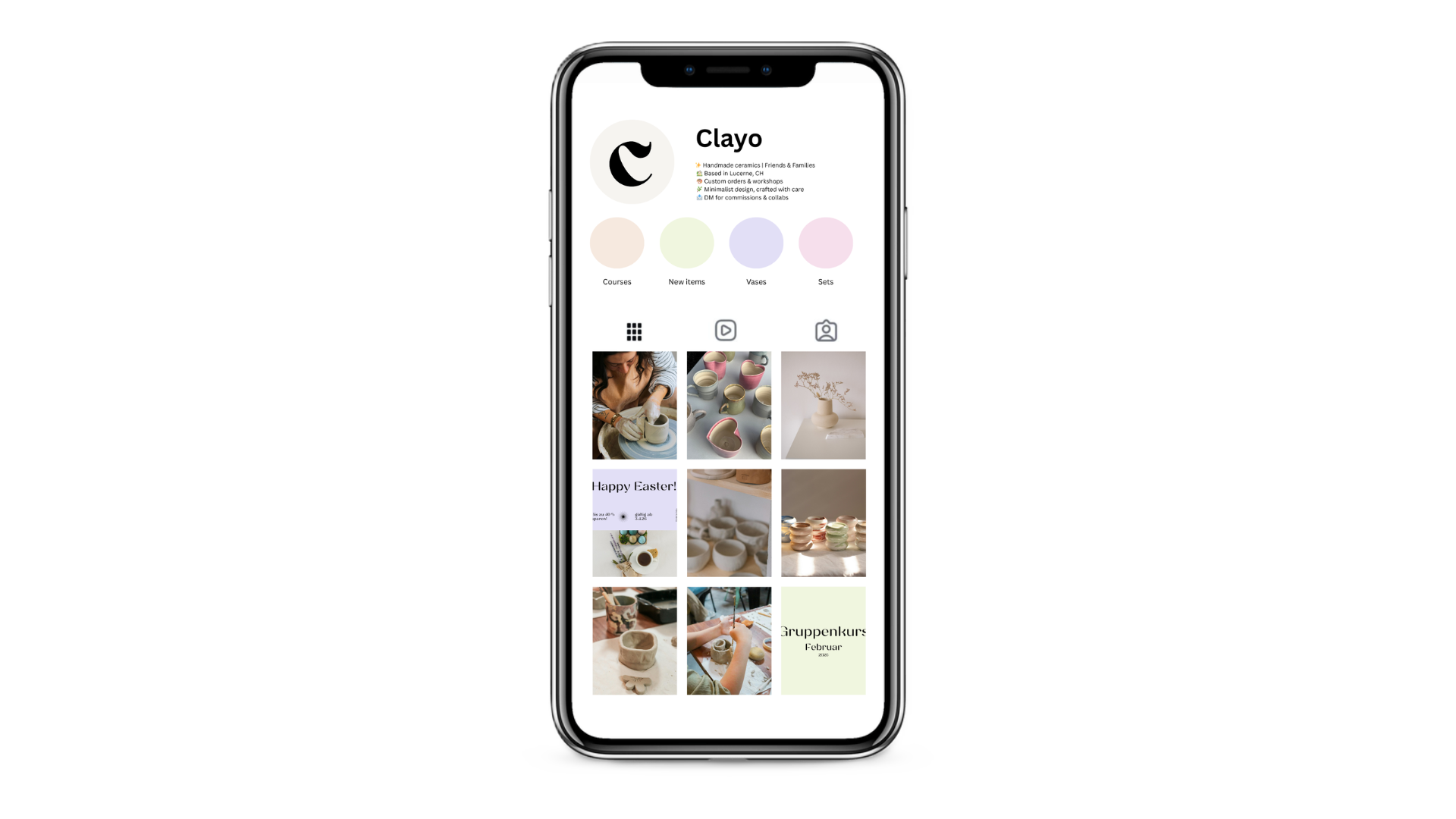 Atelier Clayo ist ein fiktives Kreativstudio für Keramik. Ziel war es, einen konsistenten Instagram-Auftritt zu entwickeln, der visuelle Qualität, Markenidentität und Content-Strategie kombiniert. Das Projekt zeigt meine Kompetenz in Content Creation, Social Media Management und visuellem Storytelling.